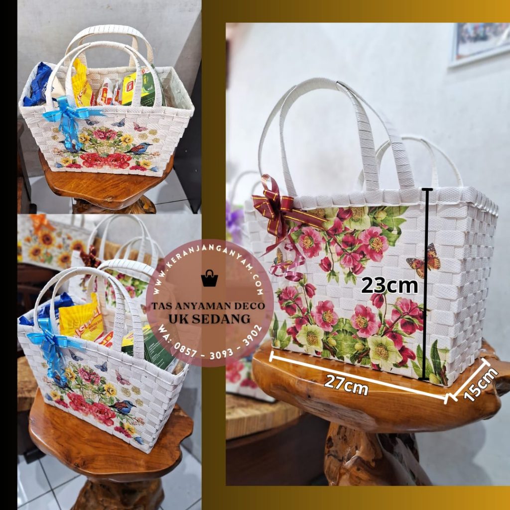 Keranjang anyaman yang satu ini terbuat dari bahan embos kualitas premium. Bahan ini merupakan salah satu bahan yang kuat. Keranjang anyaman ini dilengkapi dengan gambar Deco yang cantik dan menarik, sehingga tampilan ketika digunakan terlihat manis. Keranjang anyaman ini memiliki banyak fungsi/multifungsi. Bisa digunakan sebagai keranjang sembako/tas sembako, keranjang hantaran/tas hantaran, keranjang parcel/tas parcel, sebagai keranjang souvenir/tas souvenir maupun tas belanja/keranjang belanja.